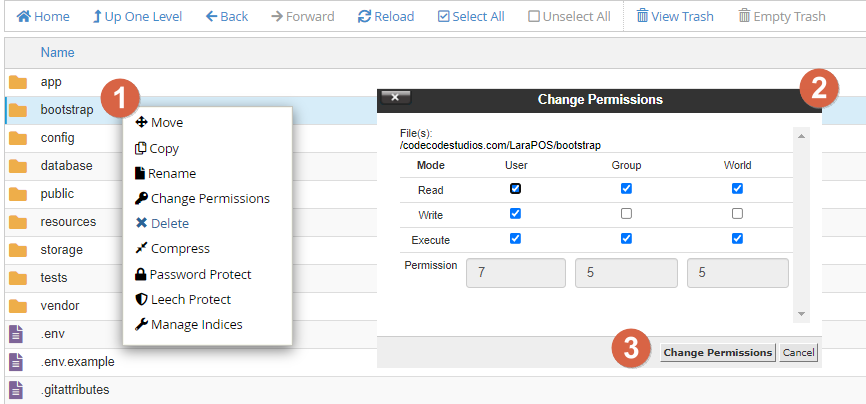 .envfile. You can either re-upload that file and the rest of such files, like the.htaccessfiles, or the .zip file onto the server and extract it there.This can also happen when moving files around using Cpanel's file manager. Make sure to go toSettings > Preferencesand checkShow hidden Files (dotfiles), so hidden will also be selectable.Another reason for which you might get a 500 error on the installation step is missing PHP extension. Thestorage/logs/laravel.logfile can be checked to get the exact extension/reason. -
