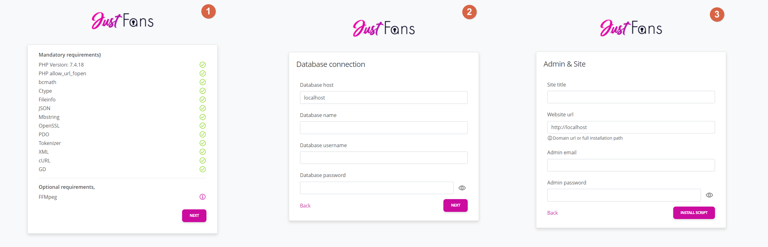 - 6.3. In this form you'll be able to set up site's name, your admin user and validate your script license.